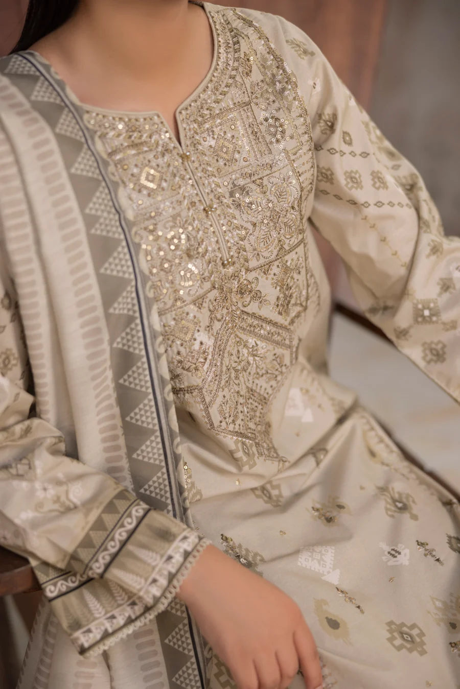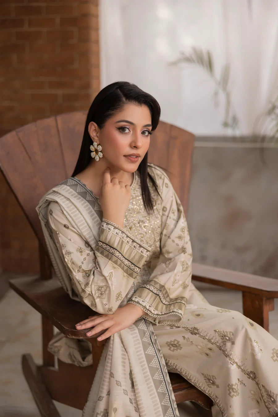A classic three-piece beige suit, enriched with intricate embroidery in gold and subtle grey tones. The shirt features geometric and floral-inspired motifs, giving it a regal touch. The dupatta is adorned with delicate patterns and borders, completing a look that is perfect for formal events or festive gatherings.