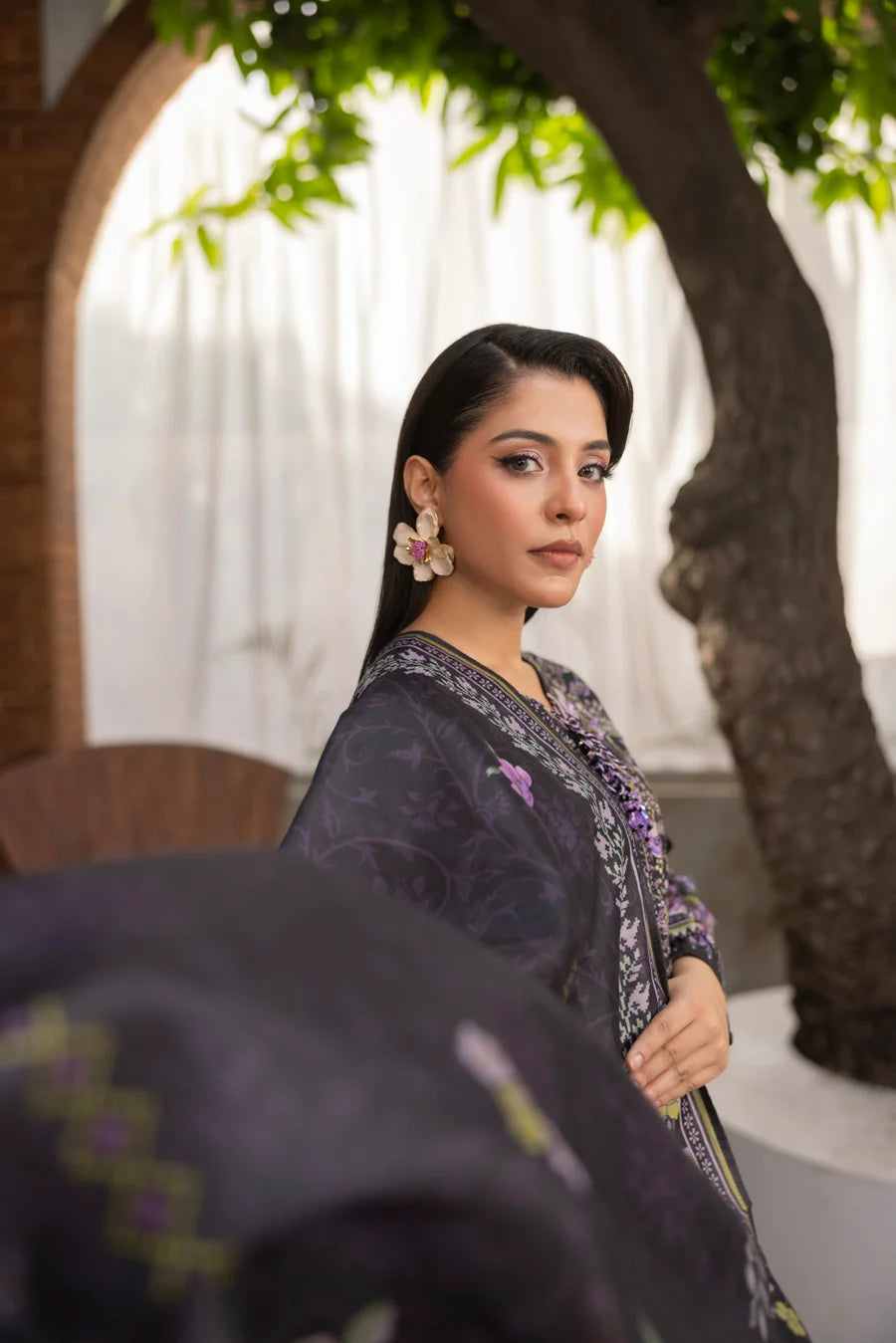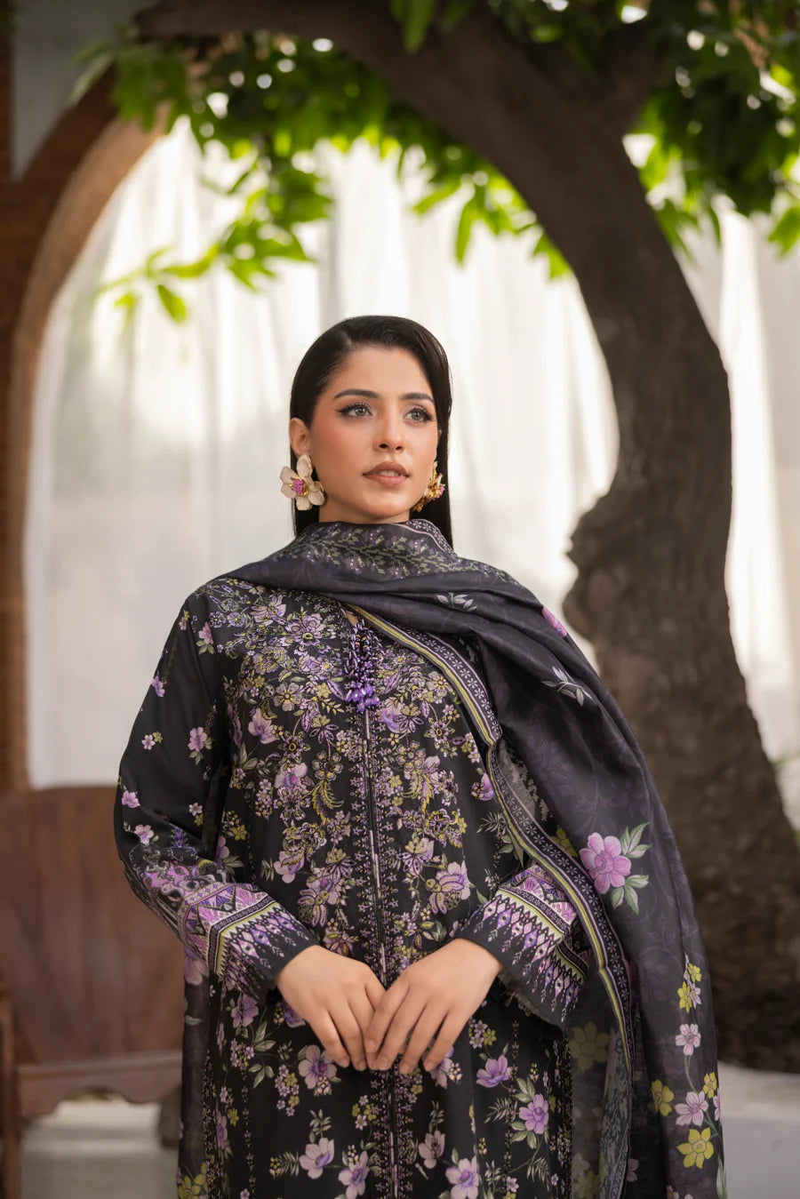 A striking black three-piece suit beautifully adorned with purple and lilac floral prints, enhanced with touches of yellow and green. The shirt features an elegant floral arrangement that flows harmoniously with the borders and sleeves. The dupatta complements with floral detailing, creating a chic yet timeless look perfect for evening gatherings and festive wear.
