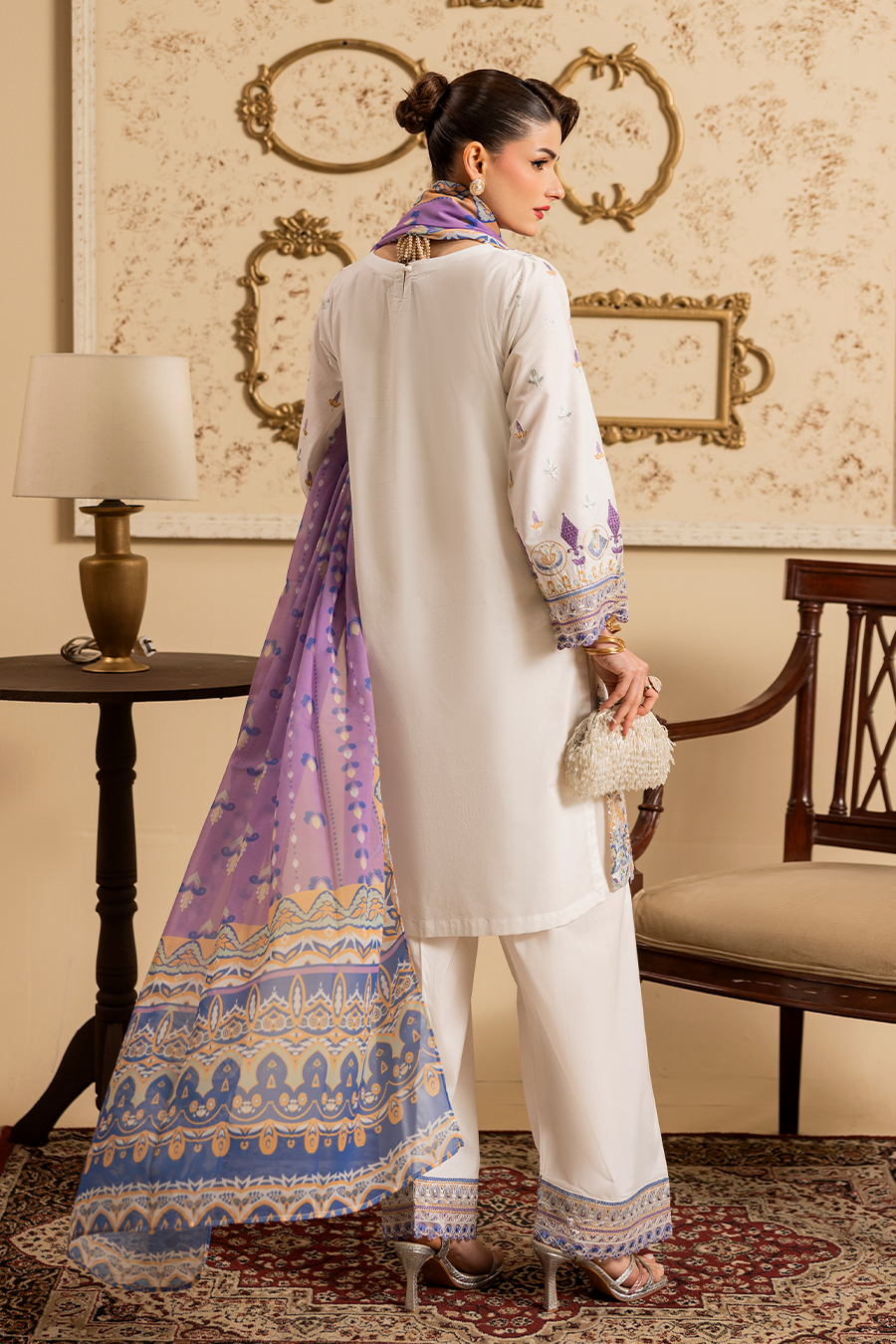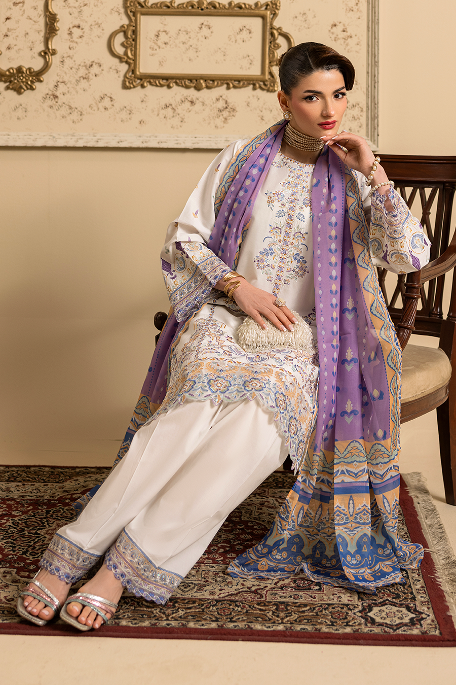 Cressida – Luxury Pret (3PC) is a graceful summer outfit designed for elegance and comfort. The breathable cotton shirt features detailed embroidery with delicate 3D accents, creating a refined and sophisticated look.